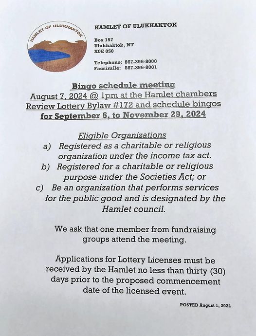 Review Lottery Bylaw #172 and schedule bingos for September 6 to November 29, 2024