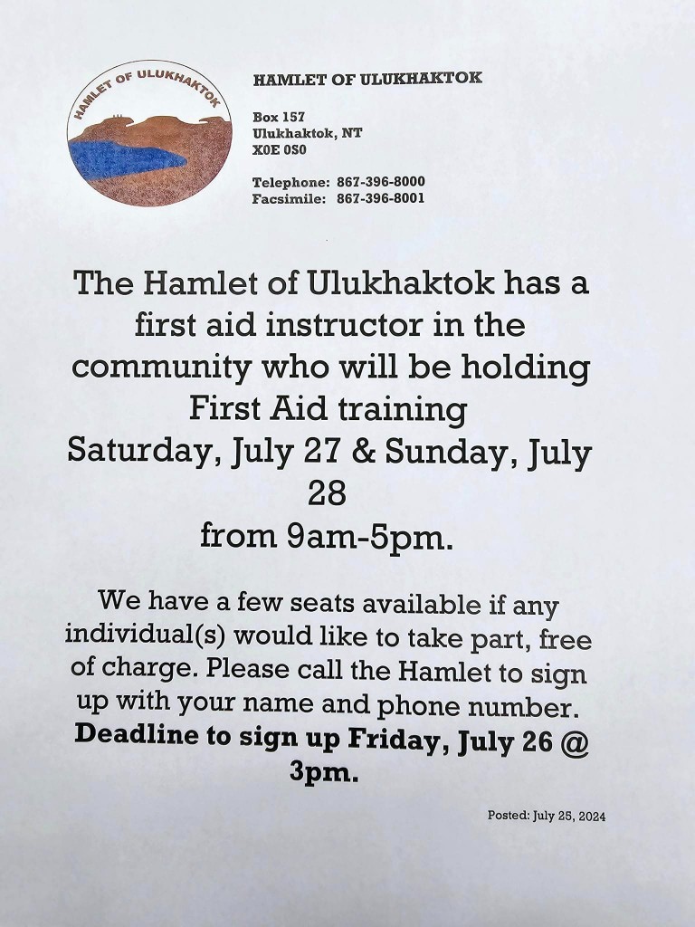 The Hamlet of Ulukhaktok has a first aid instructor in the community who will be holding First Aid training Saturday, July 27 and Sunday July 28 from 9am – 5pm.